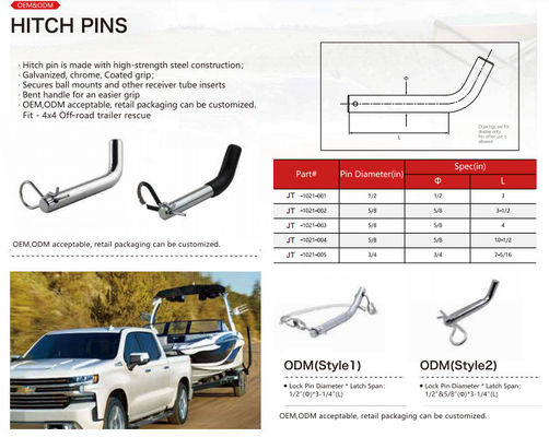 Hitch pins are essential, quick-release fasteners designed for securing linkages and attachments. Typically featuring an L-shaped or R-shaped design with a spring-loaded locking mechanism (often a cotter pin, hairpin clip, or linch pin), they provide a fast, reliable way to connect and disconnect components like trailer hitches, tow bars, machinery parts, and agricultural implements. Made from durable, hardened steel for strength and corrosion resistance, hitch pins ensure critical connections stay firmly in place during operation while allowing for easy removal when needed. Their simplicity, strength, and speed make them indispensable for towing, farming, construction, and industrial applications.