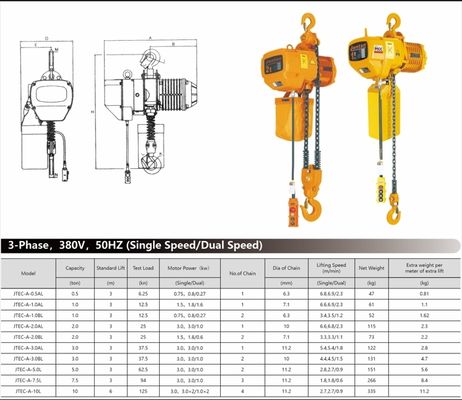 | Model | Capacity | Standard Lift | Test Load | Motor Power(kw) | No.of Chain | Dia of Chain | Lifting Speed (m/min) |